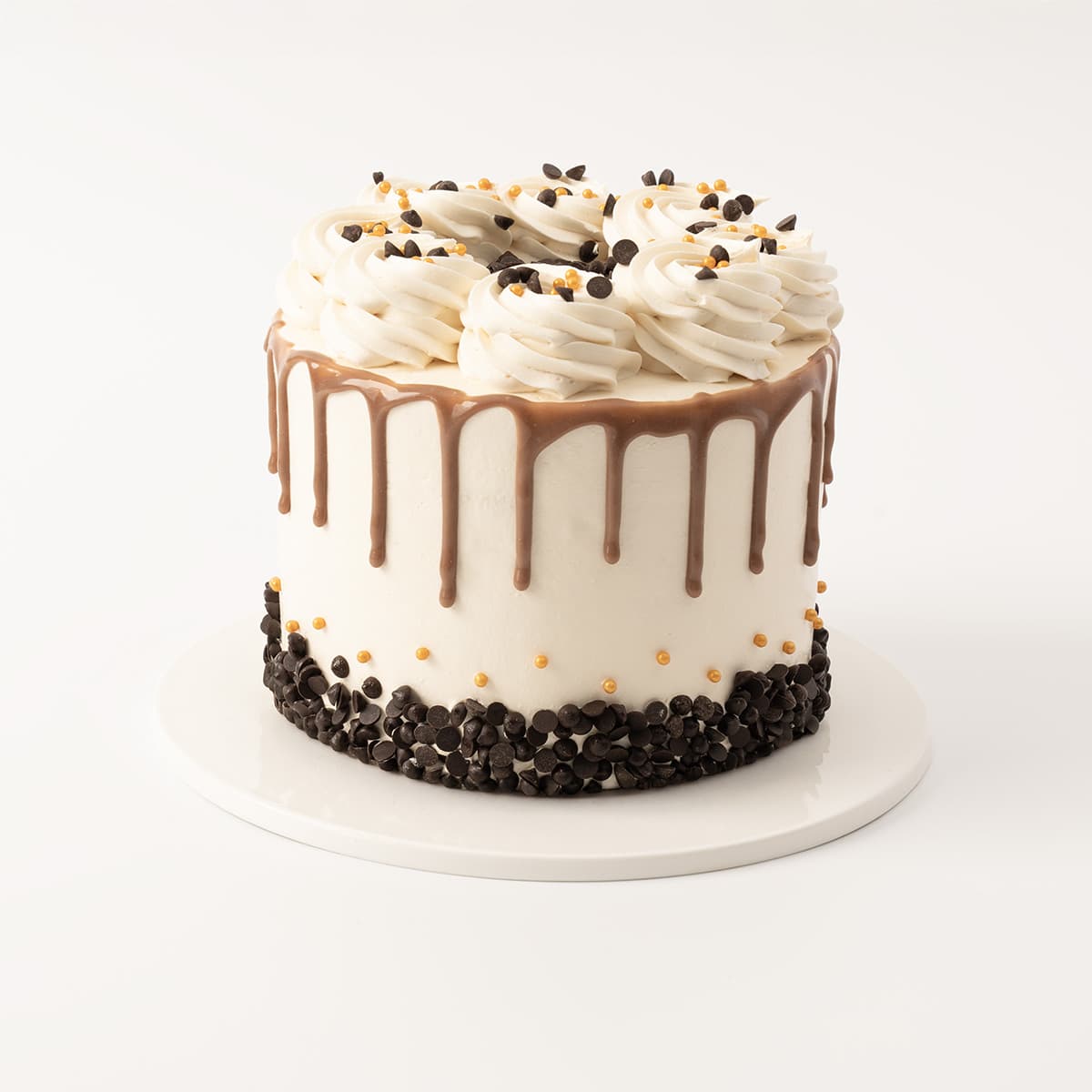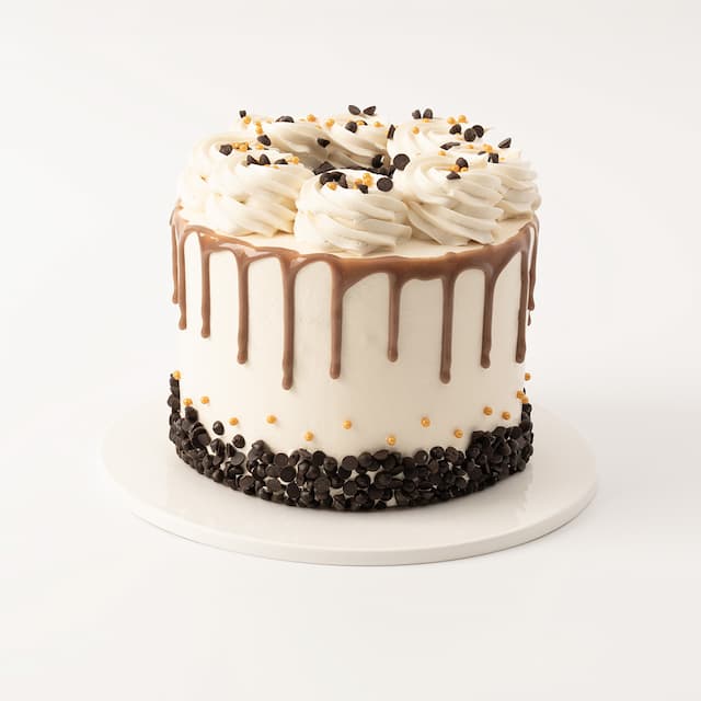 Vanilla sponge layered with fresh caramel cream and gooey caramel. Coated in mousse and finished with a milk choc drip, rosettes, gold pearls and choc chips. 3 day pre-order period applies.
