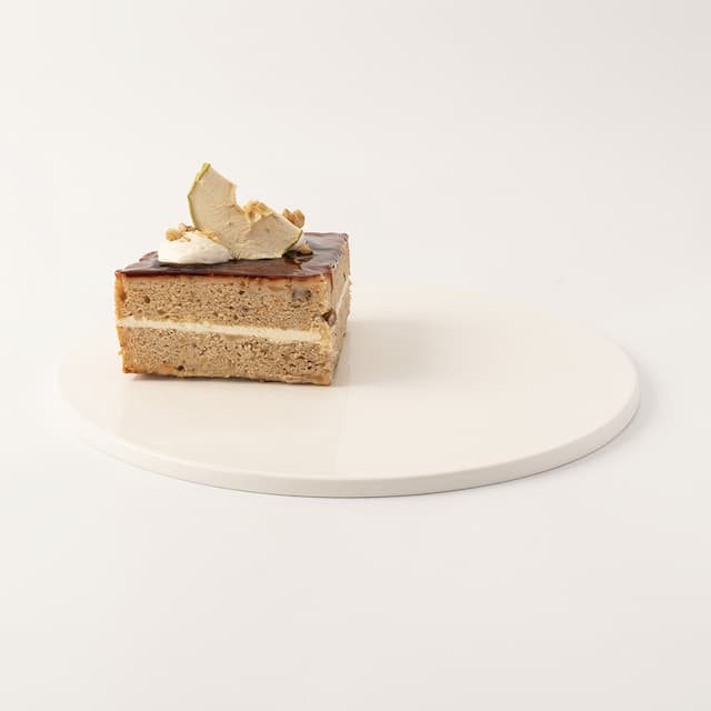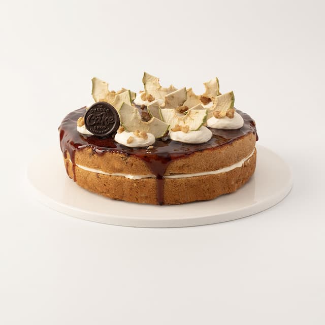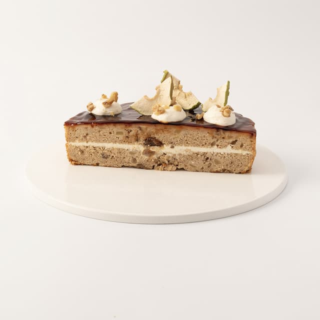A flourless cake with sultanas, walnuts and apple pieces throughout. Filled with cheesecake and topped with pears and a caramel glaze. Garnished with cheesecake piping, walnuts and dehydrated green apples.