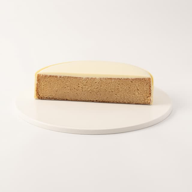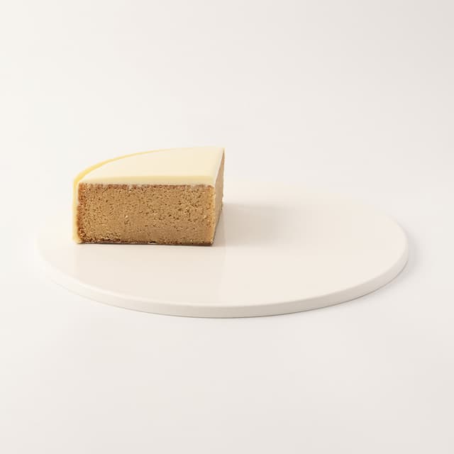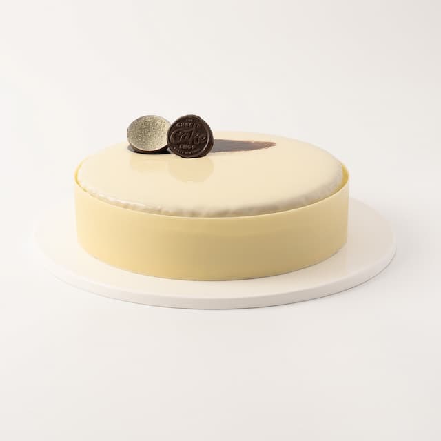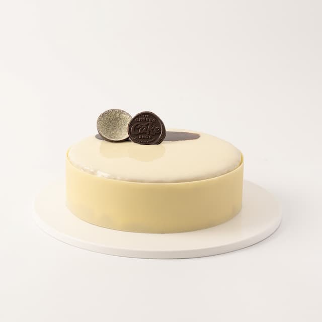 A white chocolate mudcake, coated in a premium white chocolate glaze and finished with a Belgian white chocolate collar.