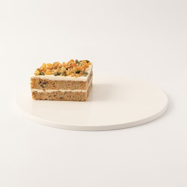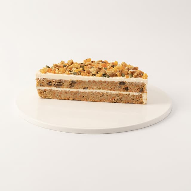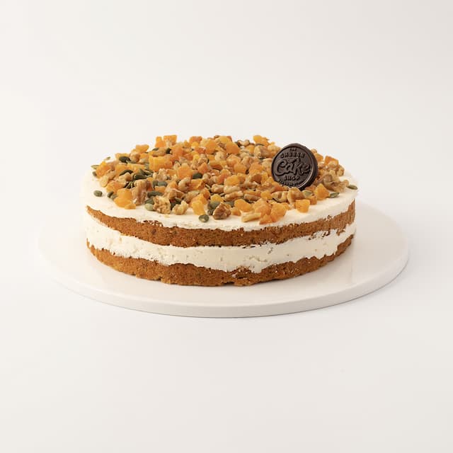 A flourless cake with fresh carrots, sultanas and walnuts throughout. Layered and topped with cheesecake and garnished with dried apricots, pepitas and walnuts.