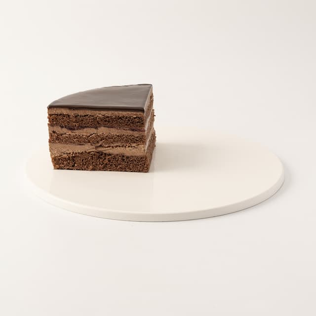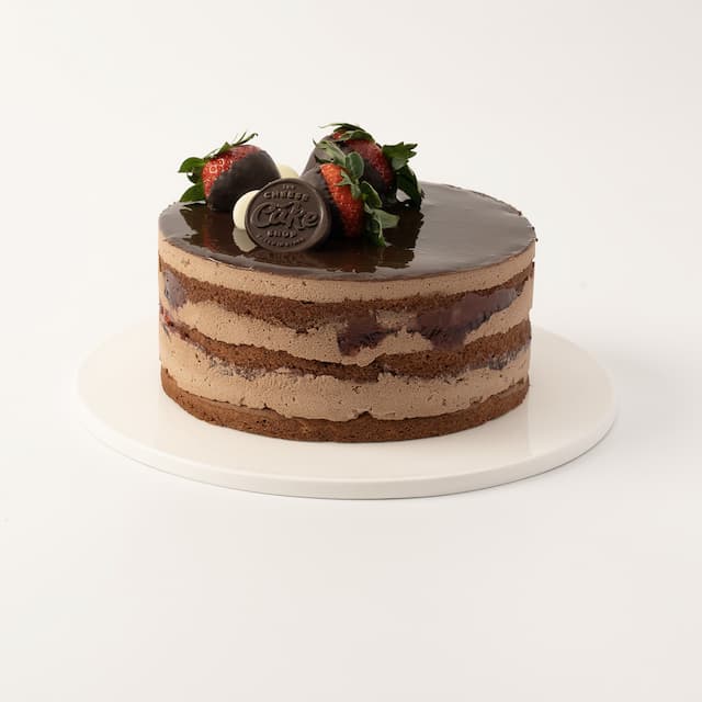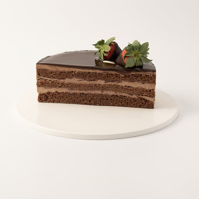 Chocolate sponge layered with chocolate cream and natural strawberry filling. Finished with chocolate mousse piping and Belgian white chocolate shards.