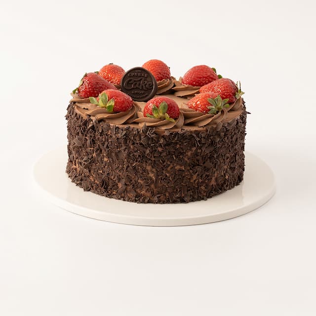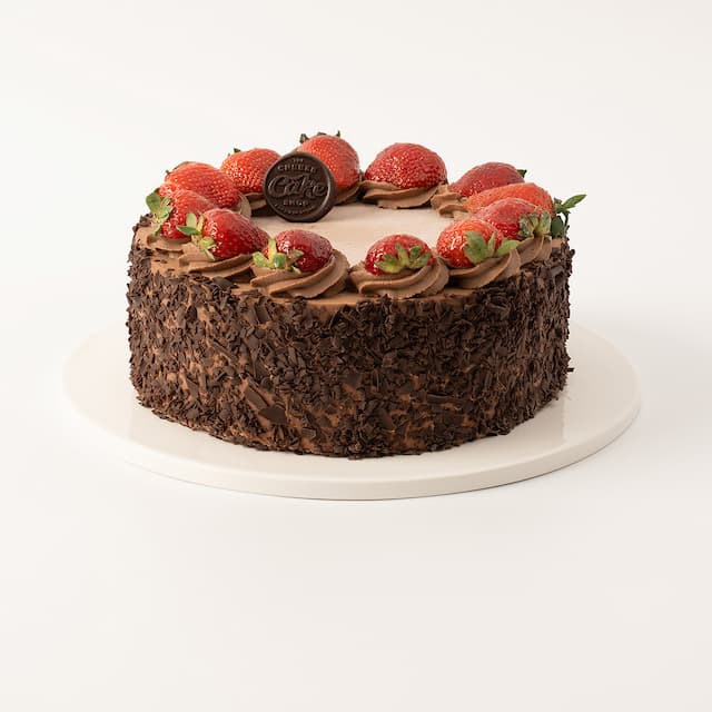 Eggless chocolate sponge layered with vegetarian chocolate cream and natural strawberry filling. Finished with cream rosettes and maraschino cherries. May contain traces of egg.