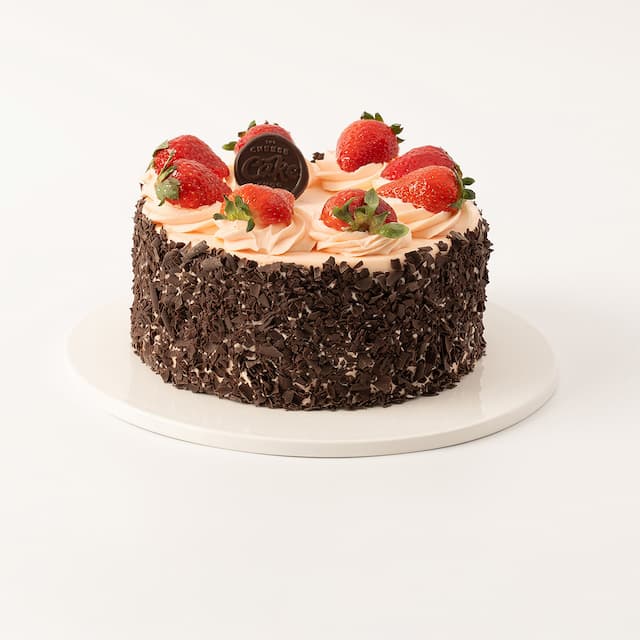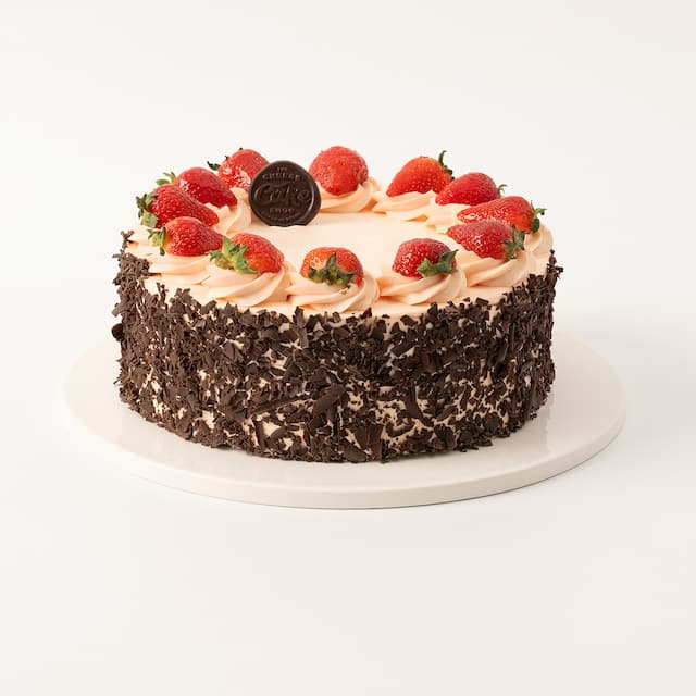 Eggless vanilla sponge layered with vegetarian strawberry flavoured cream and natural strawberry filling. Finished with cream rosettes and maraschino cherries. May contain traces of egg.