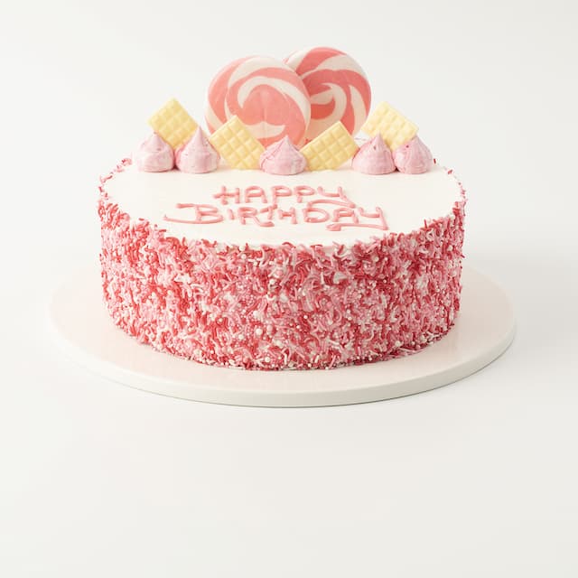 Layers of white sponge, vanilla cream and strawberry pulp, masked with mousse and a pink sprinkle medley. Finished with writing, white chocs, lollipops and bubblegum mousse piping.
