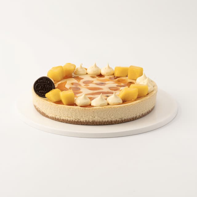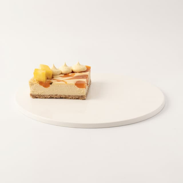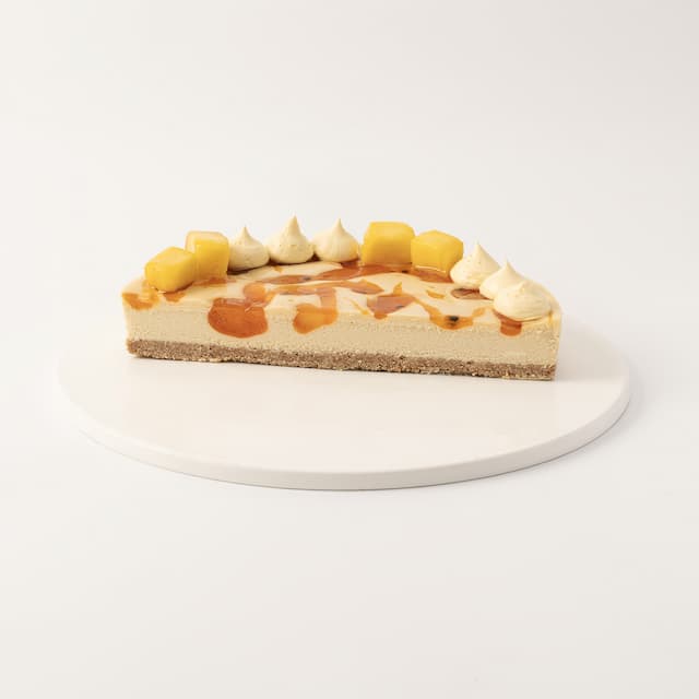 A vanilla cheesecake, with swirls of mango compote baked on a biscuit base. Finished with pieces of delicious mango and a passionfruit flavoured mousse.
