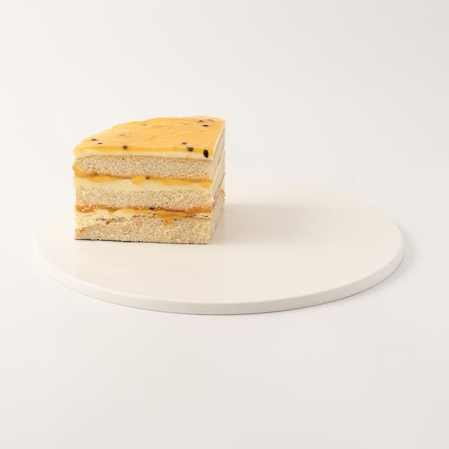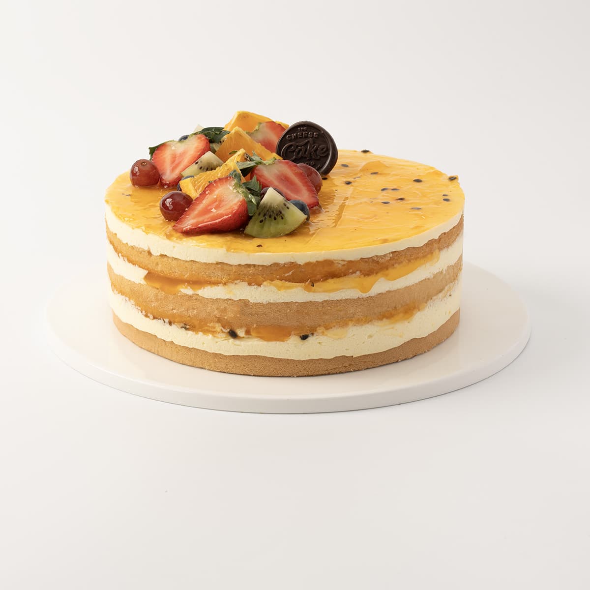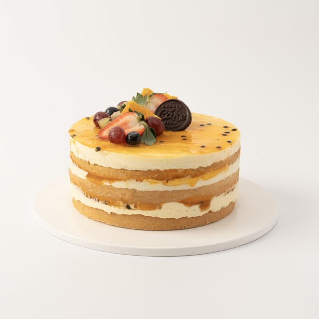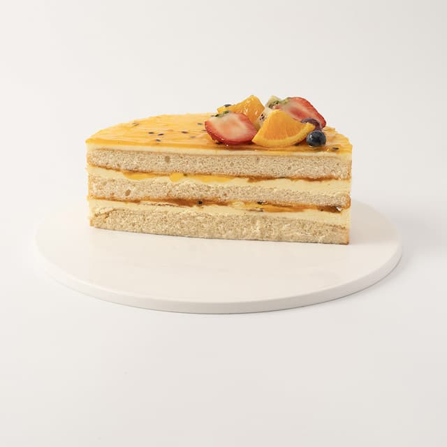Vanilla sponge layered with passionfruit flavoured cream and natural passionfruit filling. Finished with a passionfruit glaze and seasonal fresh fruits.